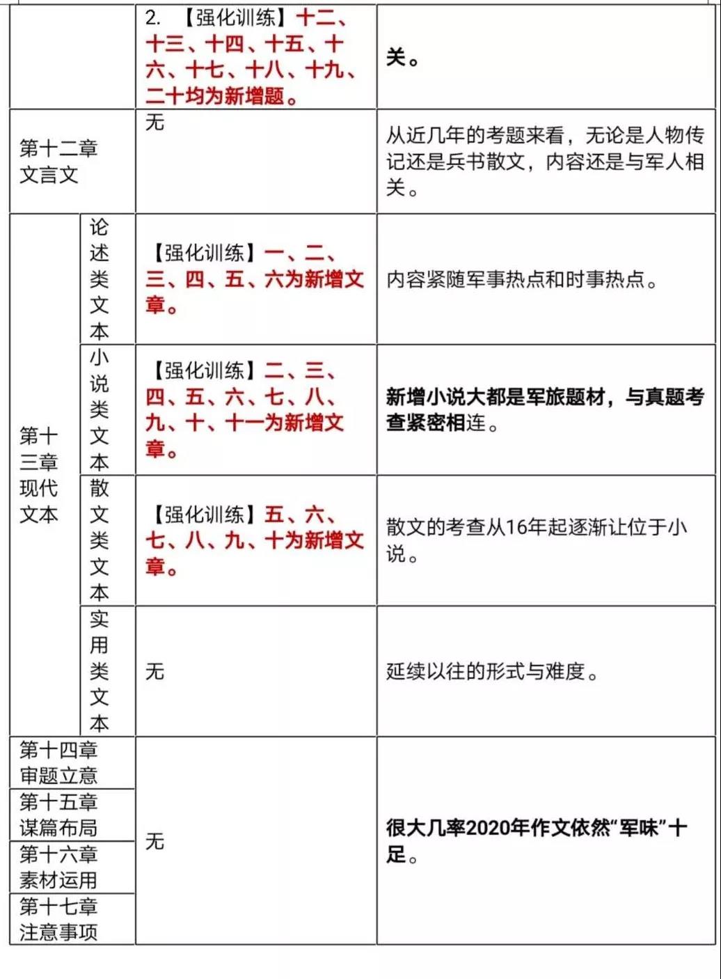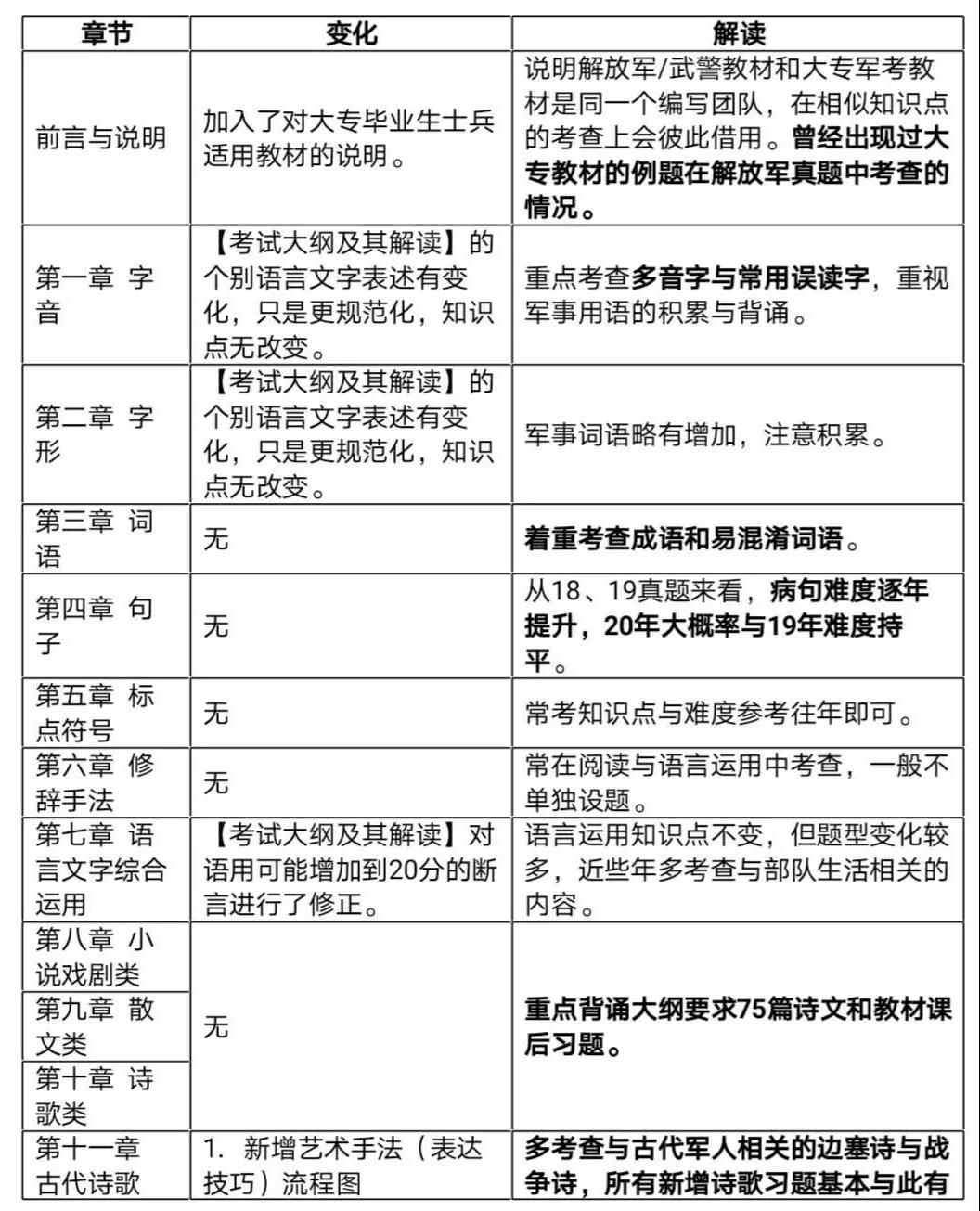 上期我们德方军考教研组第一时间为大家解读了解放军/武警新教材(数学、英语、物理、化学)的变化,详情请点击后面链接:2020年军考教材(解放军/武警)有何变化? 这期我们继续为大家奉上语文和政治的解读。 语文科目 2020年军考语文教材在知识点上没有做调动,但是个别章节新增了不少习题。综合来看。变化主要有两大点: 1.部分章节对大纲与真题的解读有文字变化。